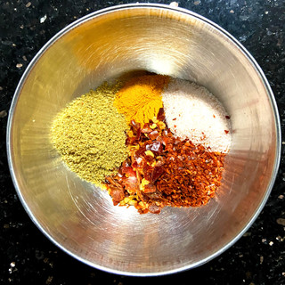 3. Add the turmeric, coriander powder, chilli powder, chilli flakes, salt, heeng and stir to mix well.
